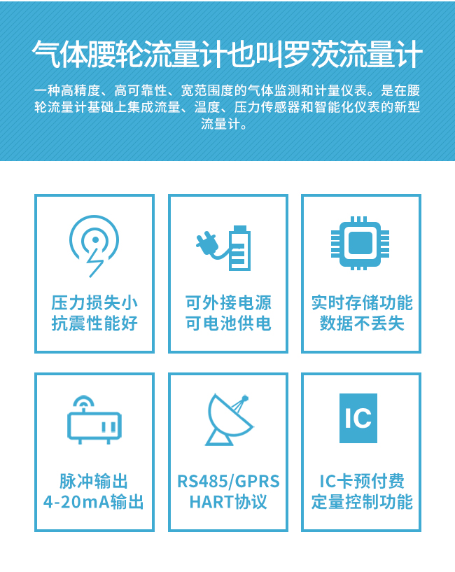 氣體腰輪流量計也叫羅茨流量計是一種高精度、高可靠性、寬范圍度的氣體監(jiān)測和計量儀表。是在腰輪流量計基礎(chǔ)上集成流量、溫度、壓力傳感器和智能化儀表的新型流量計。
